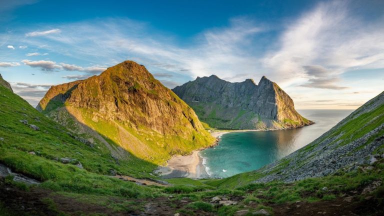 Kvalvika to niezwykła plaża o złotym piasku położona w ślicznej dolinie otoczonej majestatycznymi górami. Dotarcie do niej wymaga krótkiej, ale urokliwej wędrówki przez górskie szlaki, co czyni ją idealnym miejscem na relaks i podziwianie spektakularnych widoków. Przy odrobinie szczęścia i odwagi będziemy mogli zakosztować tu kąpieli w chłodnych wodach Morza Norweskiego!
